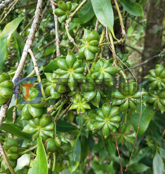 八角果實成熟時,樹枝上還有花和幼果,所以采果時不能用竹竿打落果,也不宜搖動樹枝和折枝,只能上樹采摘