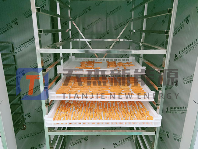 放進(jìn)紅薯干烘干機(jī):待紅薯干烘干機(jī)設(shè)備溫度升到大約30℃時(shí),將紅薯片放入烘干機(jī)內(nèi)部后,關(guān)好烘干機(jī)的門。