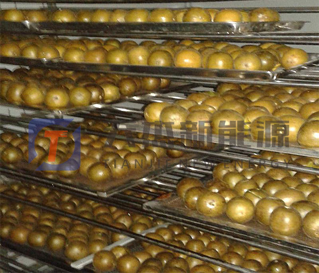 烘干③階段:降溫到55-60度之間,繼續(xù)烘干2天,使果實的重量下降到相當鮮果的25-30%即可成為干果。采取關(guān)閉空氣能烘干排濕熱泵系統(tǒng),讓其自然降溫,待冷卻后才能出爐。
